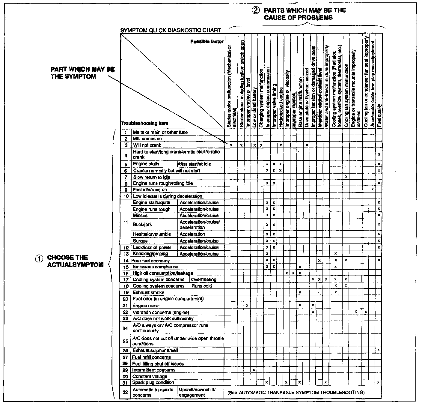- The chart is effective in quickly narrowing down the relation between symptom and cause of the malfunction. It also specifies the area of the common cause when multiple malfunction symptoms occur.