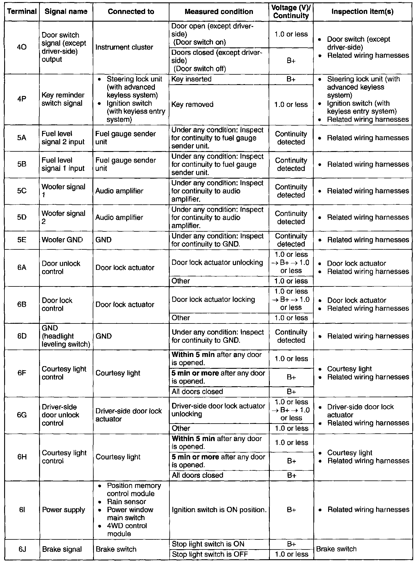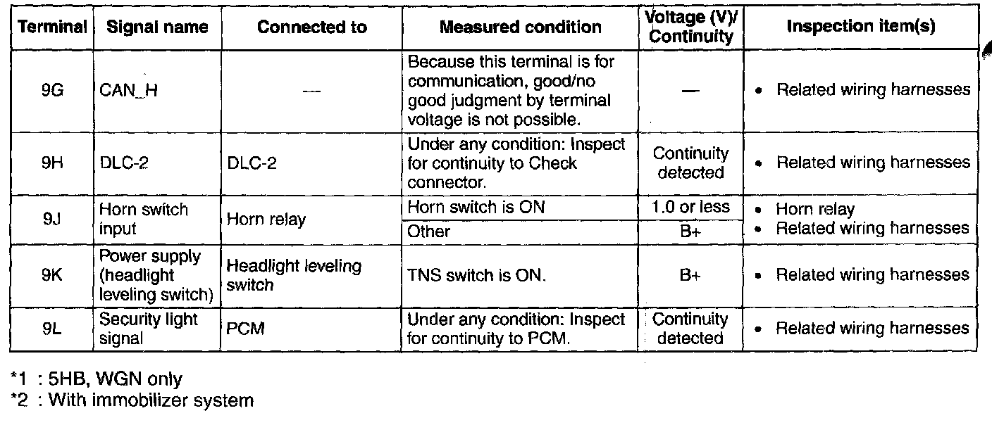 1. Measure the voltage or inspect for continuity according to the Terminal Voltage Table (Reference).