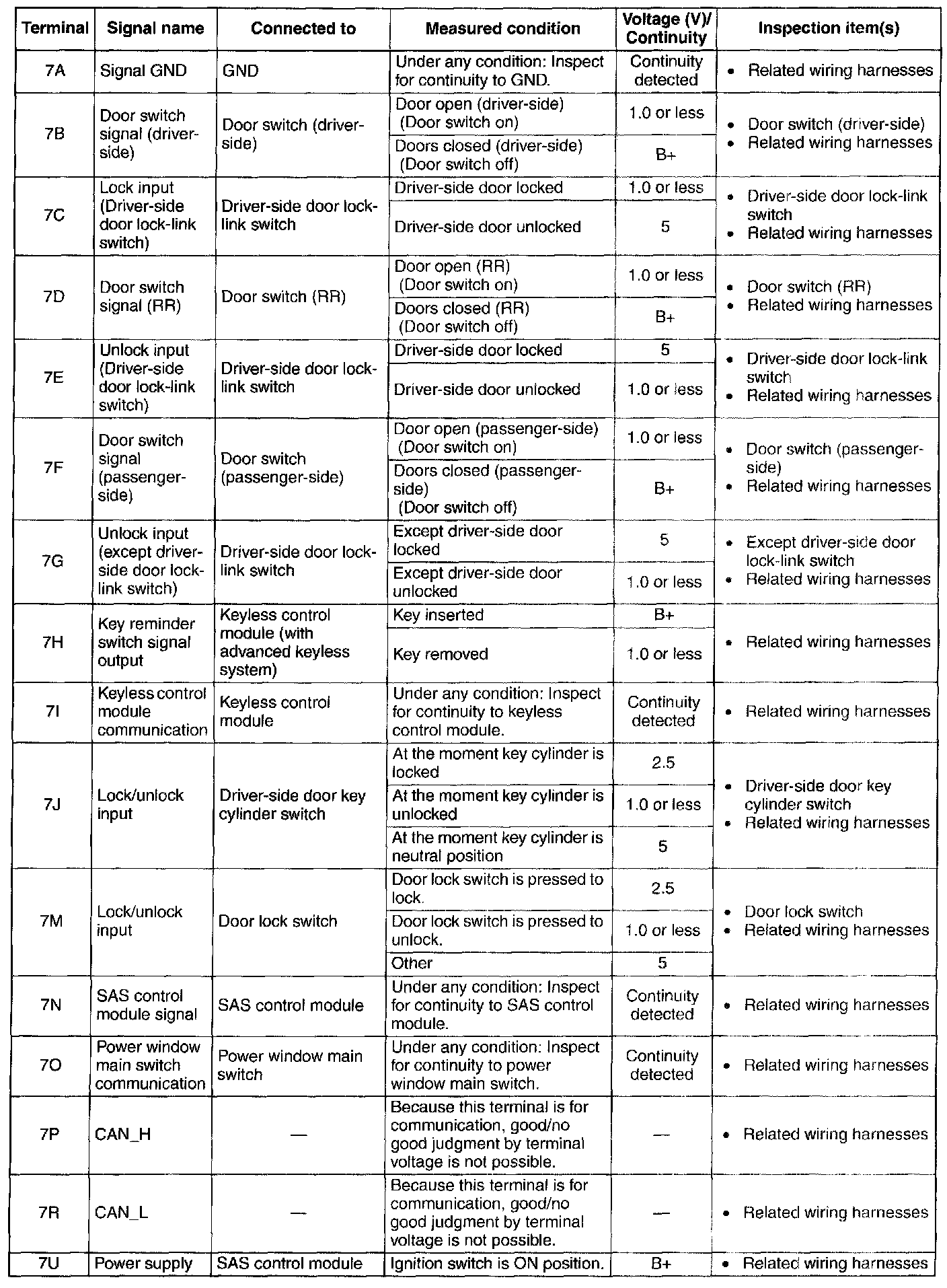 Terminal Voltage Table (Reference) - Terminals (7A-7U):