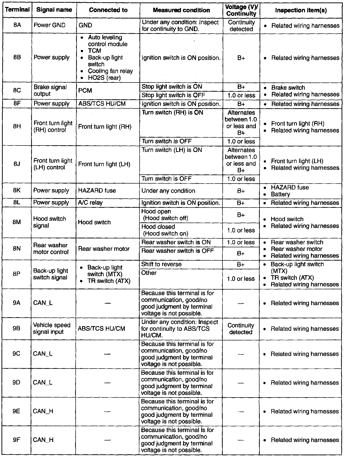 - If the voltage is not as specified in the Terminal Voltage Table (Reference), inspect the parts under "Inspection item(s)" and related wiring harnesses.