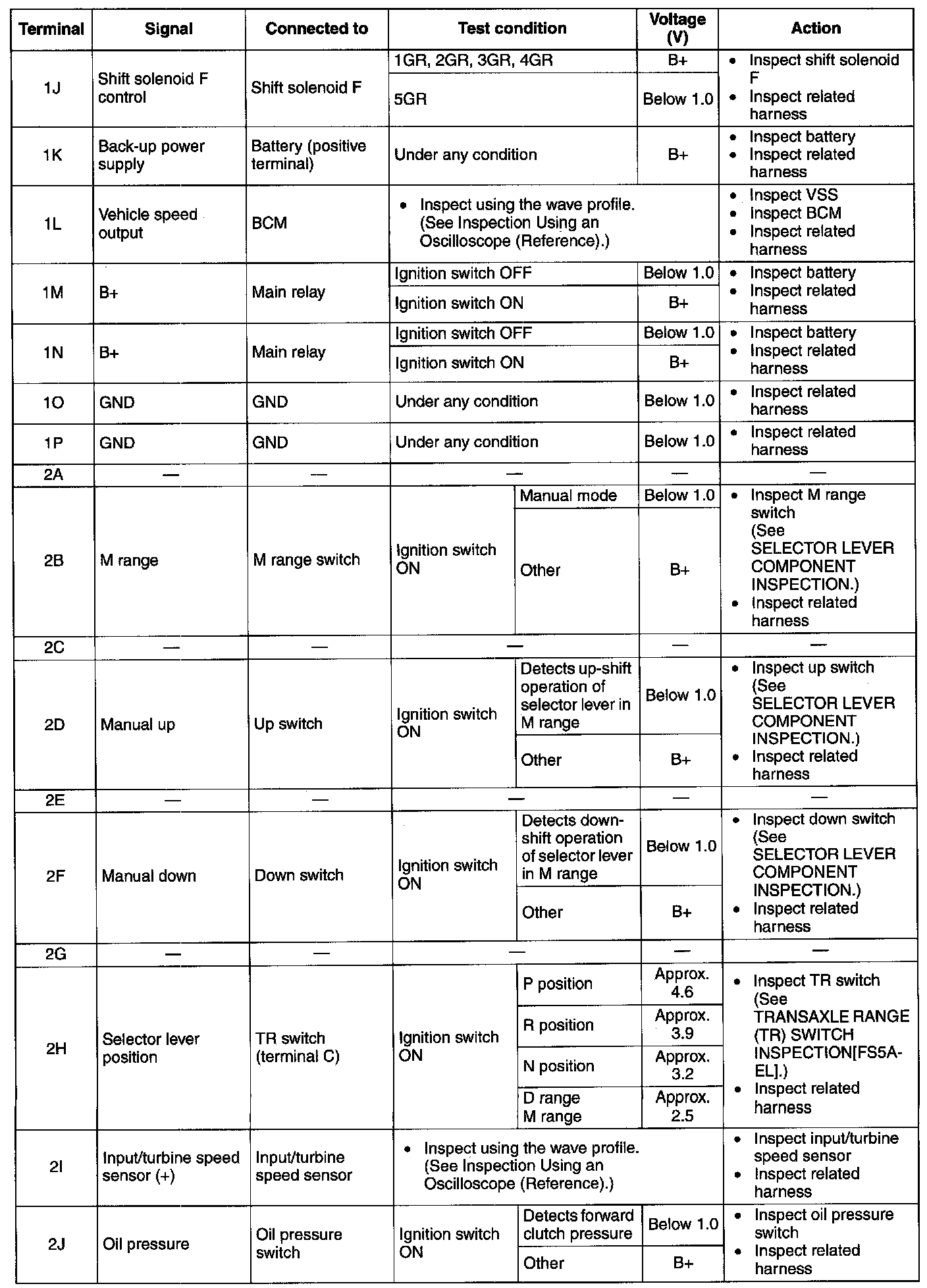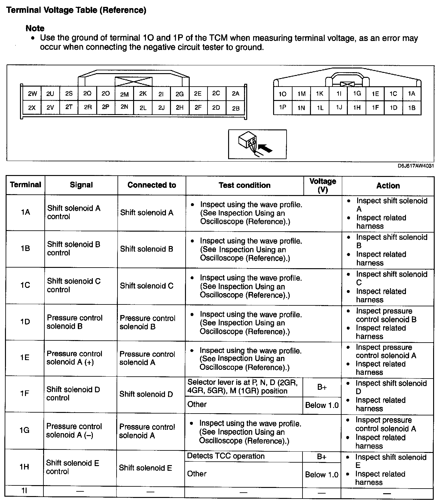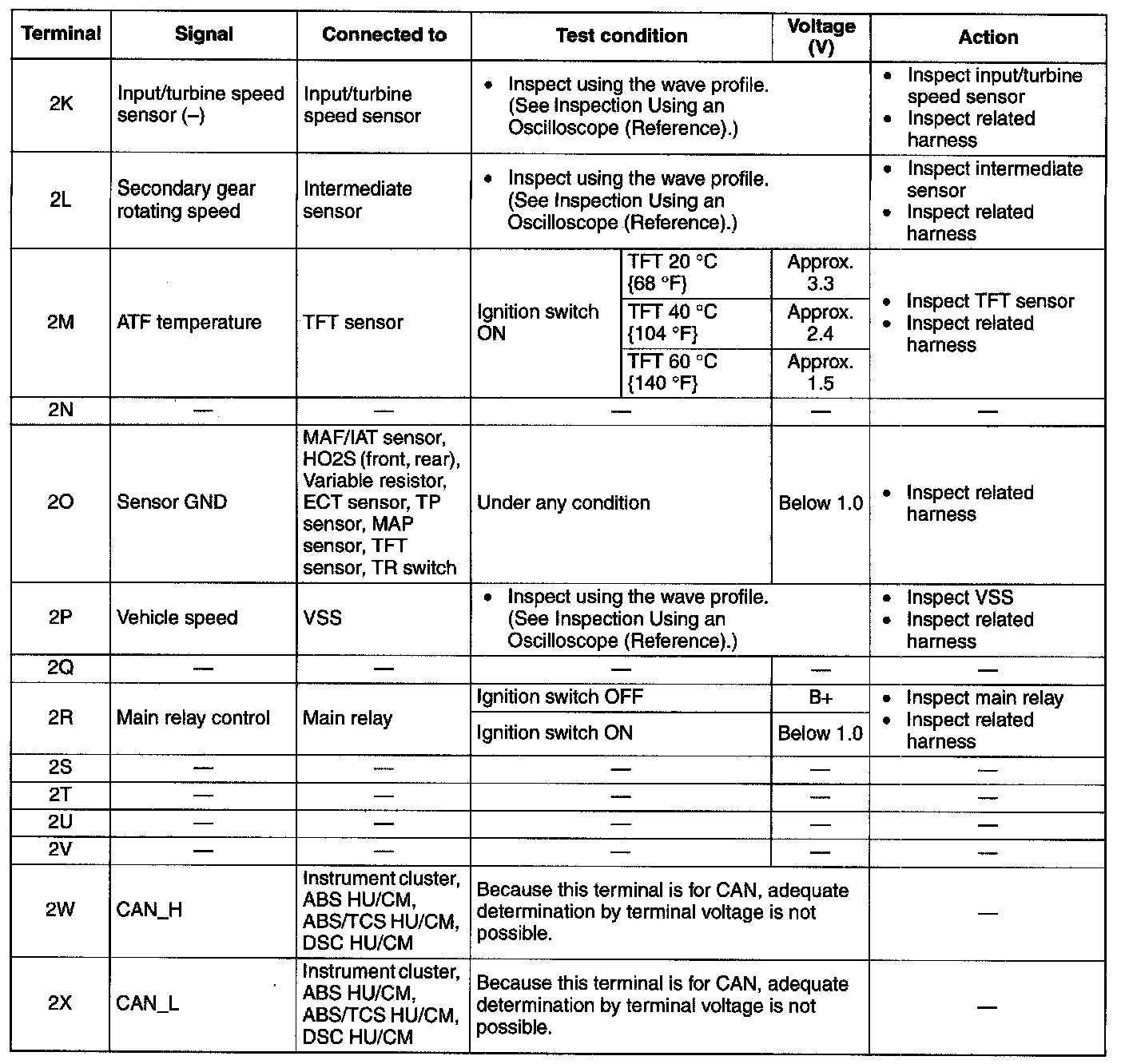 Caution: The TCM terminal voltages vary with changes in measuring and vehicle conditions. Always carry out a total inspection of the input and output systems, and the TCM to determine the cause of trouble. Otherwise, a mis-diagnosis could occur.