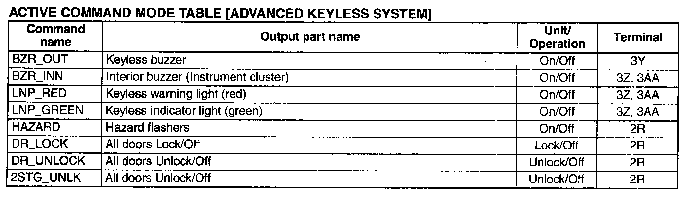Active Command Mode Table [Advanced Keyless System]: