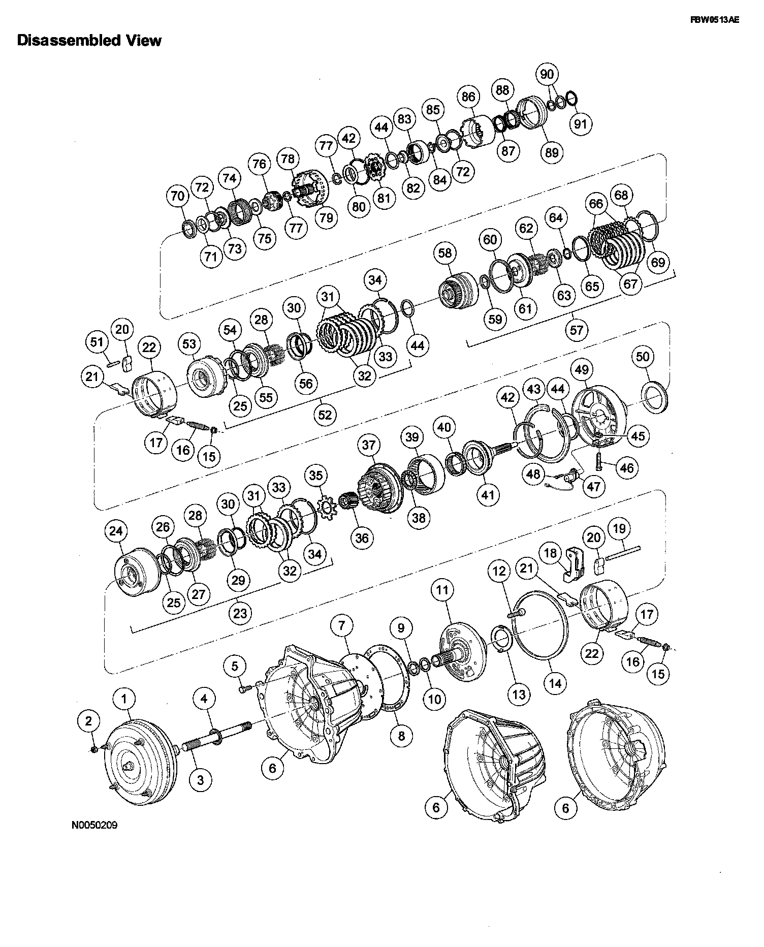 Power is transmitted from the torque converter to the planetary gearsets through the input shaft. Bands and clutches are used to hold and drive certain combinations of gearsets. This results in five forward ratios and one reverse ratio, which are transmitted to the Output shaft and differential.