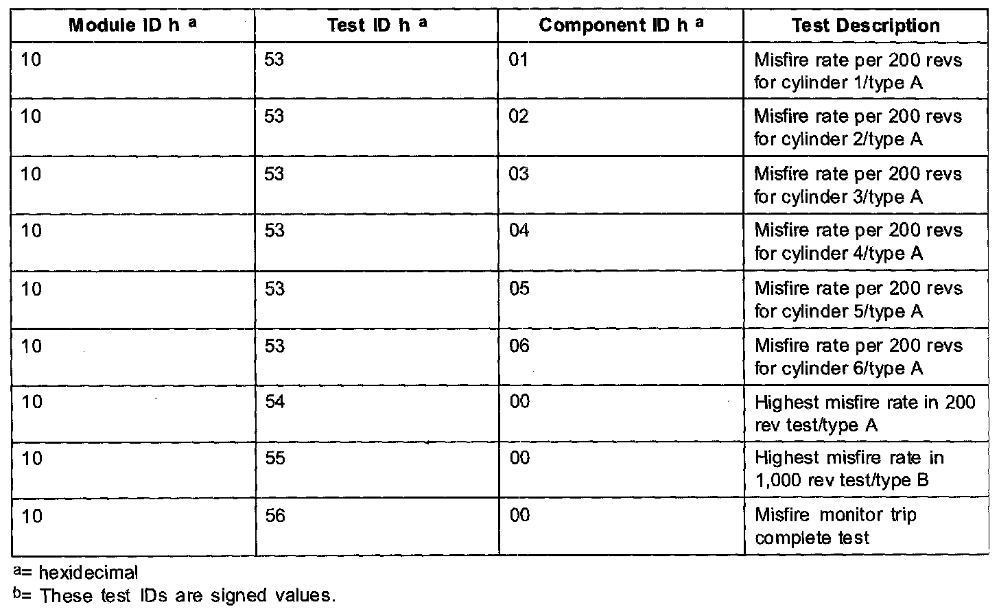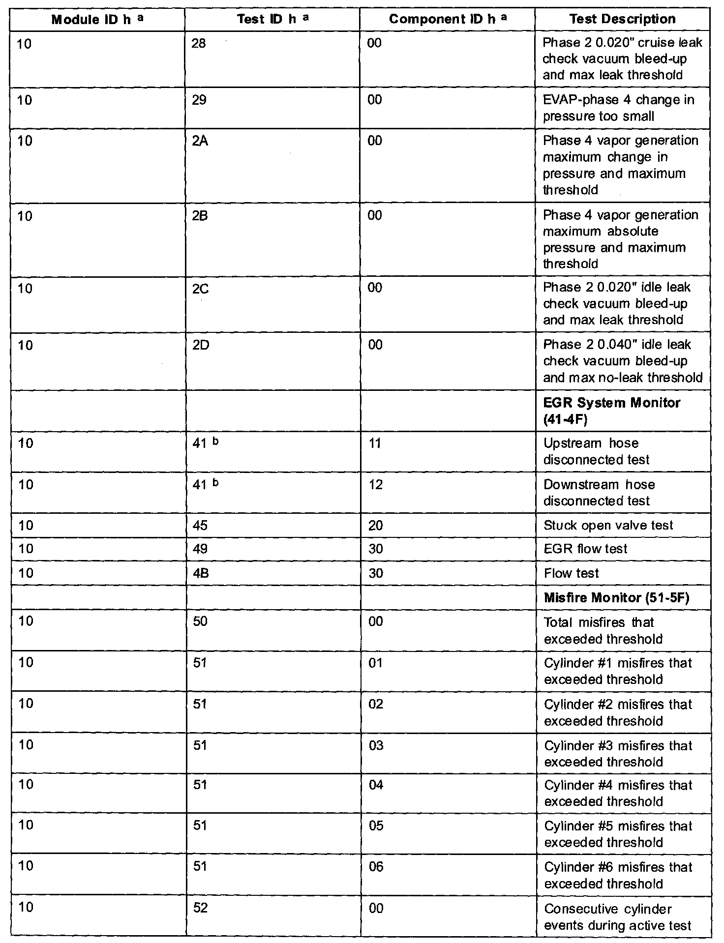 The purpose of this test mode is to allow access to the results of OBD II monitor diagnostic test results. The test values that are stored at the time of the particular monitor completion are displayed when the particular test identification is requested. See the table for test information.