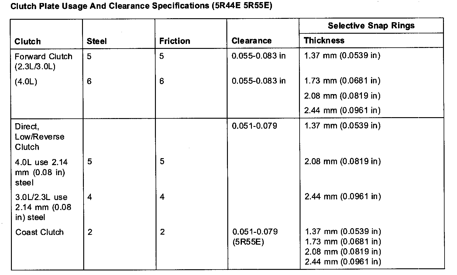 Clutch Plate Usage And Clearance Specifications (5R55E 5R44E):