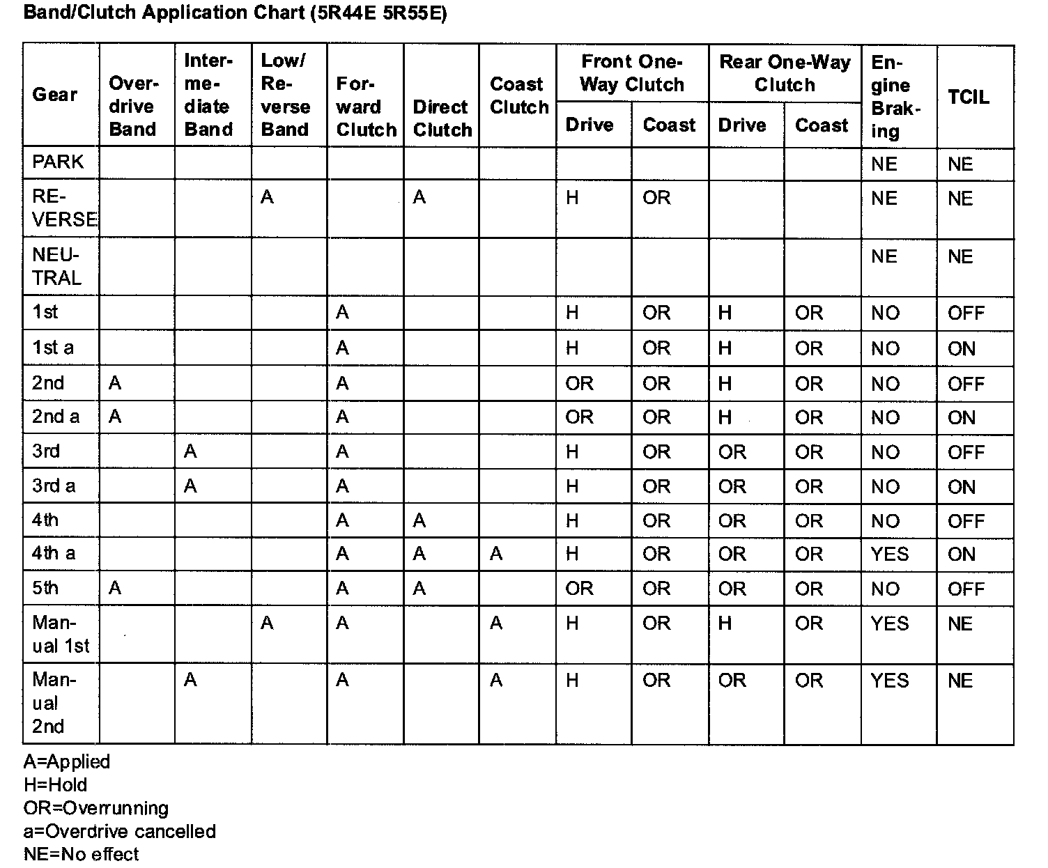 Band/Clutch Application Chart (5R55E 5R44E):