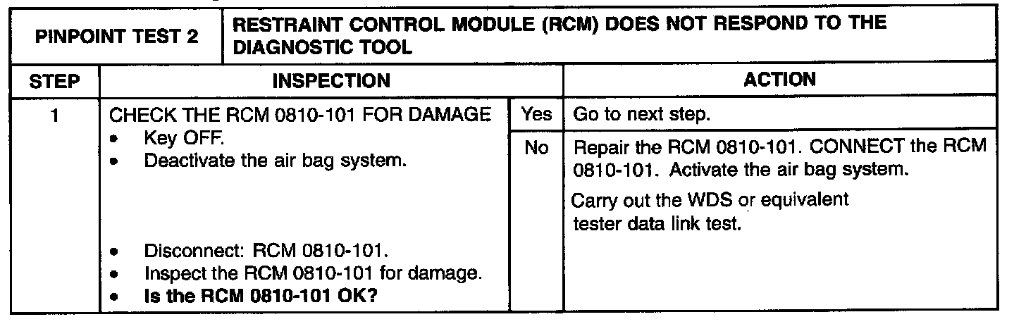 PINPOINT TEST 2: RESTRAINTS CONTROL MODULE (RCM) DOES NOT RESPOND TO THE DIAGNOSTIC TOOLNormal Operation