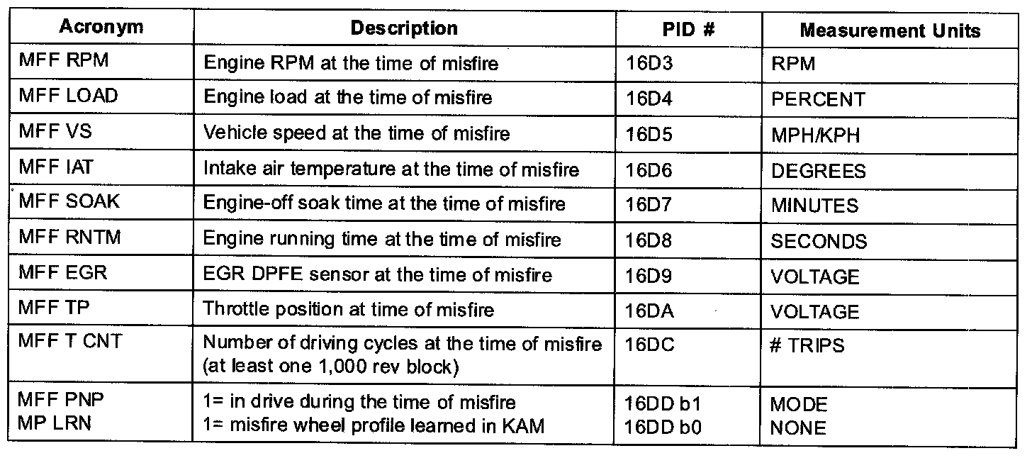 Some unique parameters (PIDs) are stored in the keep alive memory of the PCM to help in diagnosing the root cause of misfires. These PIDs are collectively called misfire freeze-frame (MFF) data. These parameters are separate from the generic freeze-frame data that is stored for every MIL code. They are used for misfire diagnosis only. The MFF data is more useful for misfire diagnosis than the normal diagnosis only. It is captured at the time of the highest misfire rate and not when the DTC is stored at the end of a 1000 or 200 revolution block. (Generic freeze-frame data for misfire can be stored minutes after the misfire actually occurred).