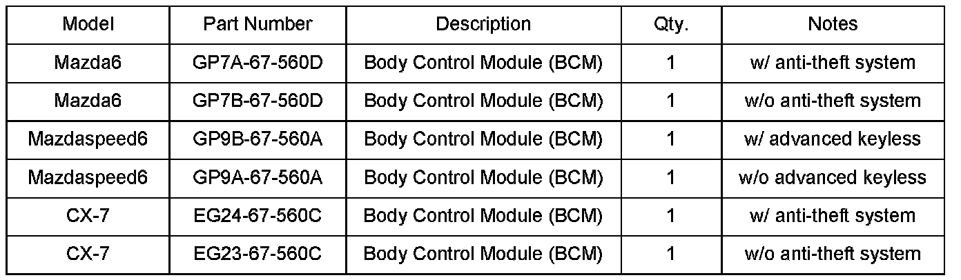 2. Replace Body Control Module (BCM) according to Mazda6 Workshop Manual (section 09-40 BODY CONTROL MODULE (BCM) REMOVAL/INSTALLATION) or CX-7 Workshop Manual (section 09-40 BODY CONTROL MODULE (BCM) REMOVAL/INSTALLATION).