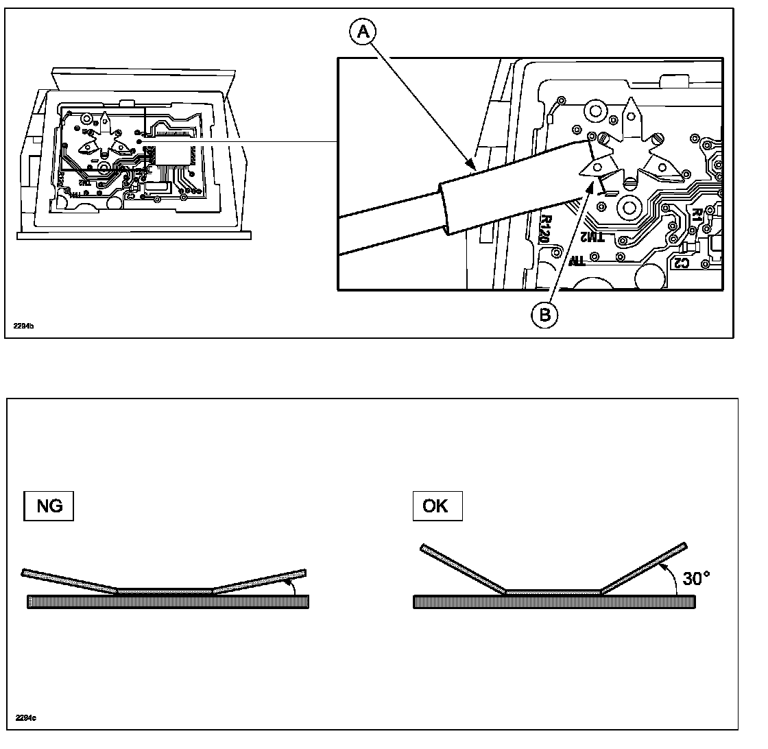 Be careful not to damage any element and/or printed pattern on the circuit board. Also, avoid bending the terminals too much as this may break it.