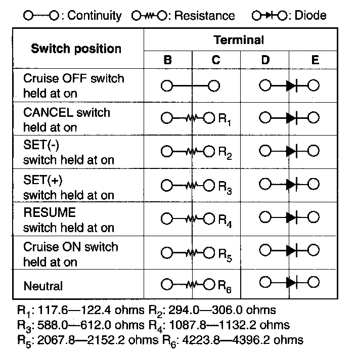 4. Inspector resistance and continuity between the cruise control switch terminals using an ohmmeter.
