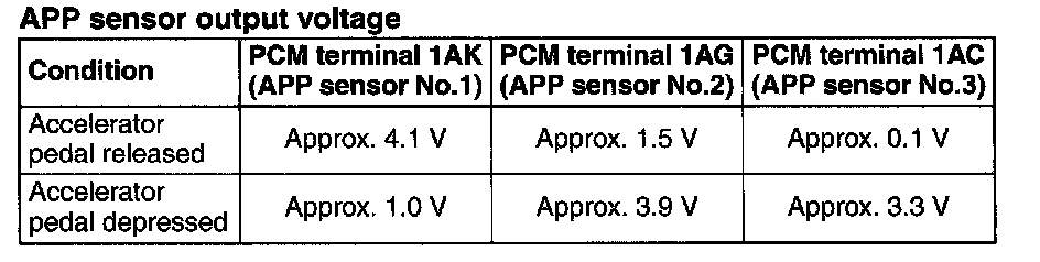ACCELERATOR PEDAL POSITION (APP) SENSOR INSPECTION [MZI-3.5]NOTE: Before performing the following inspection, make sure to follow the procedure as indicated in the troubleshooting flowchart.