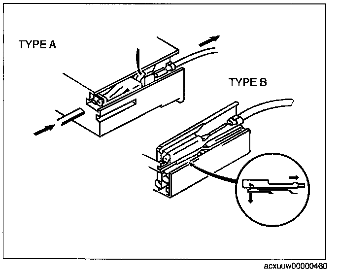 - Use the appropriate tools to remove a terminal as shown. When installing a terminal, be sure to insert it until it locks securely.
