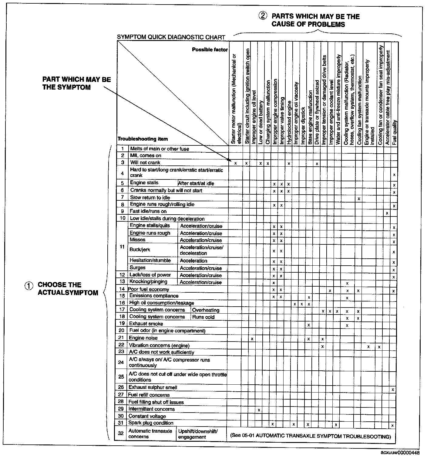 - The chart is effective in quickly narrowing down the relation between symptom and cause of the malfunction. It also specifies a range of common causes when multiple malfunction symptoms occur.