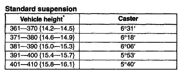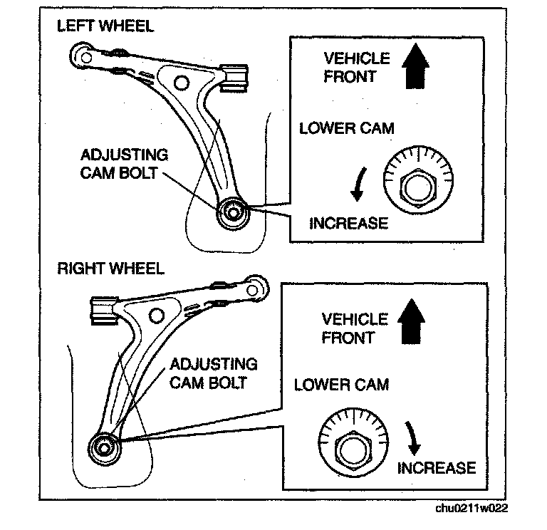 ^ The camber and caster change largely if the front cam is adjusted due to the suspension construction. If the rear cam is adjusted, the caster largely, however, the camber barely changes. Therefore, adjust the camber (front cam) and then the caster (rear cam) to adjust the alignment efficiently