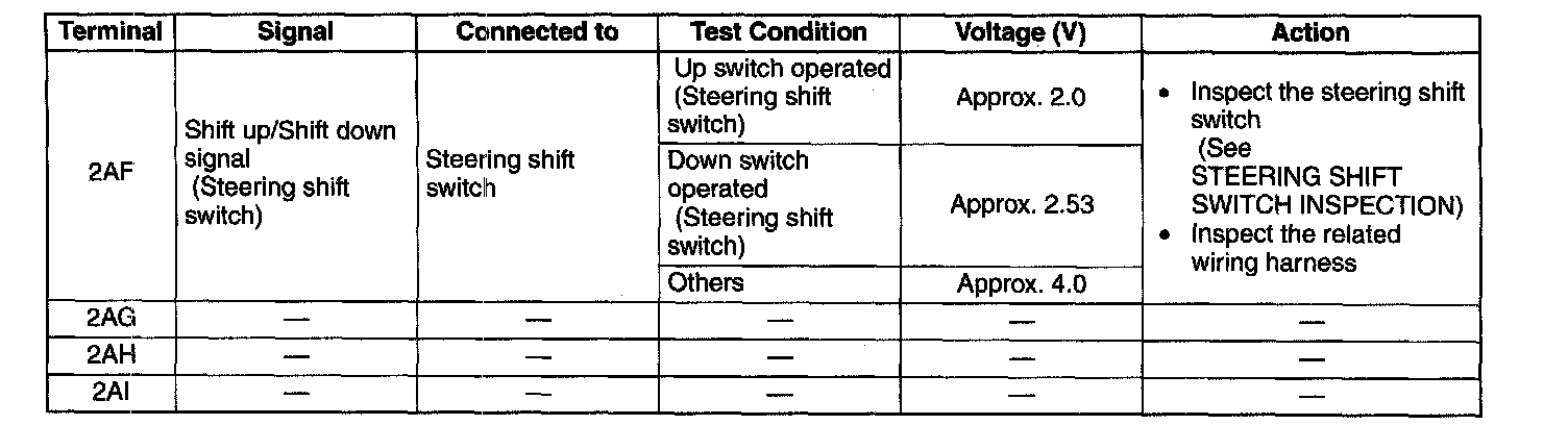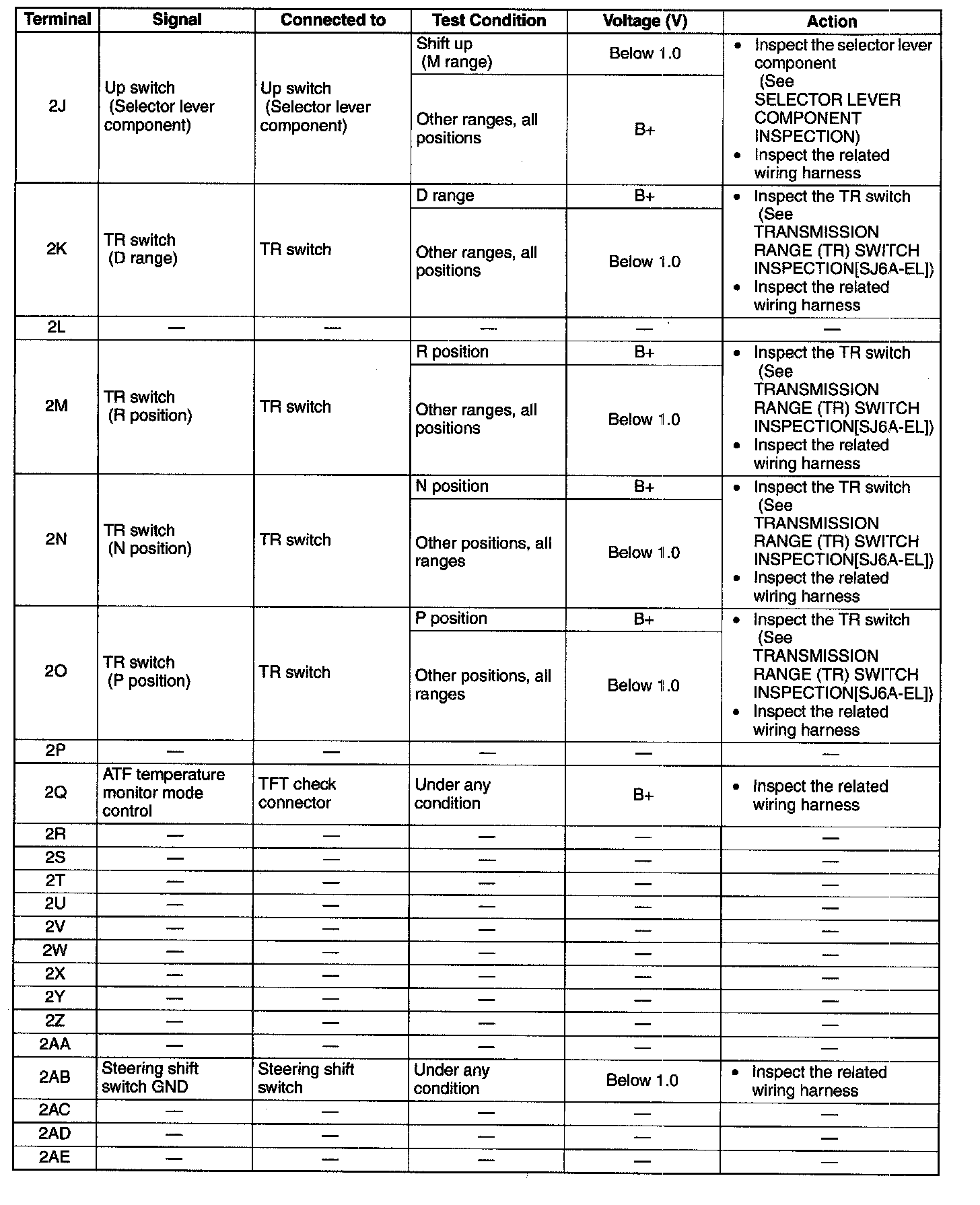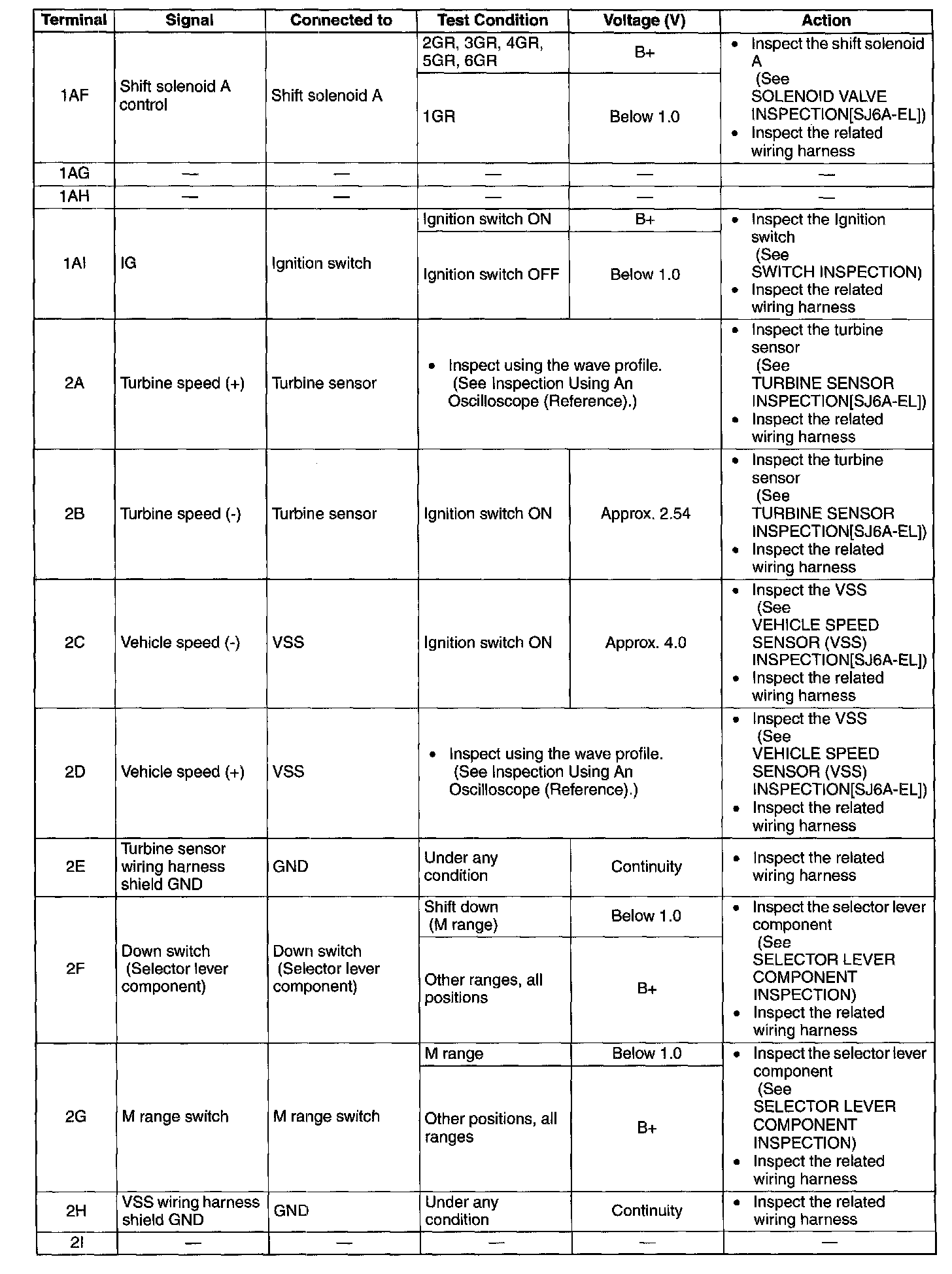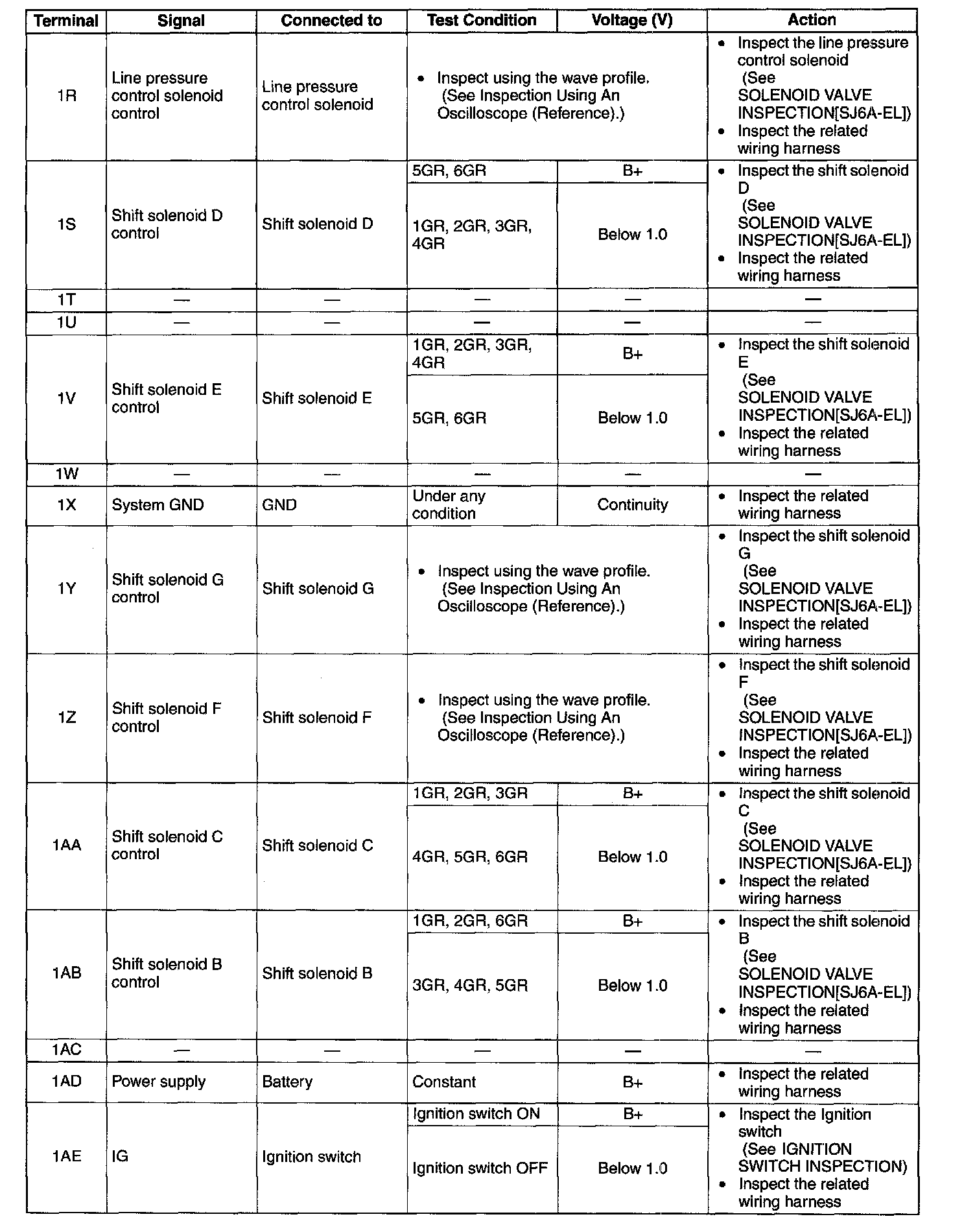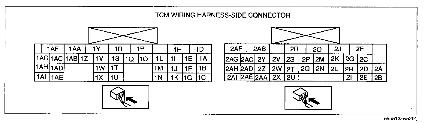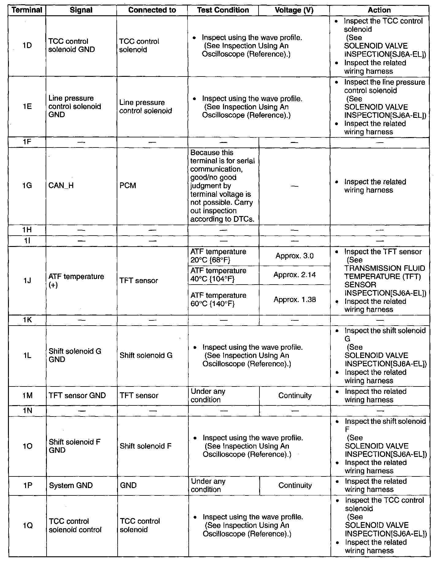 ^ Use the ground of terminal 1P and 1X of the TCM when measuring terminal voltage, as an error may occur when connecting the negative circuit tester to ground.