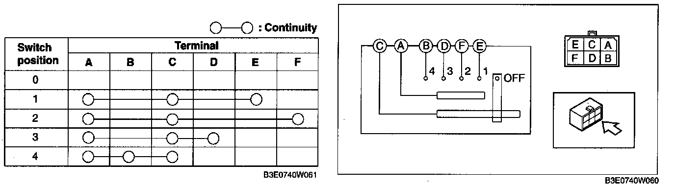 Verify that the continuity between the fan switch terminals is as indicated in the table.