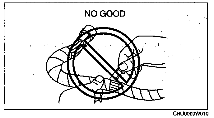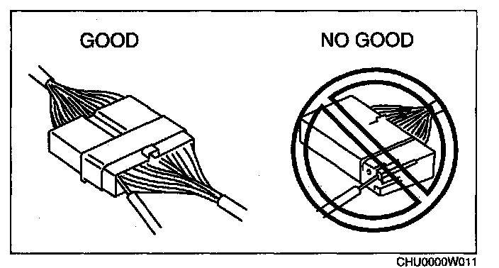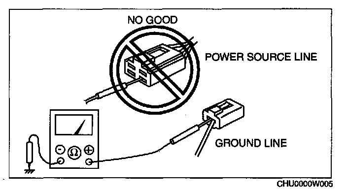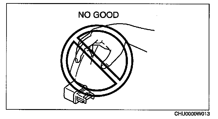 - When a tester is used to inspect for continuity or measuring voltage, insert the tester probe from the wiring harness side.