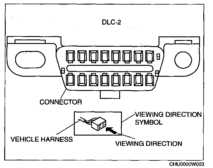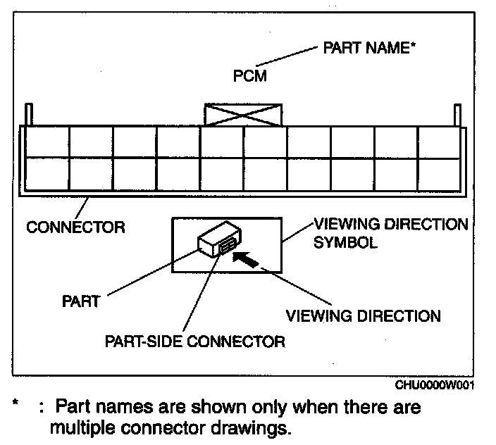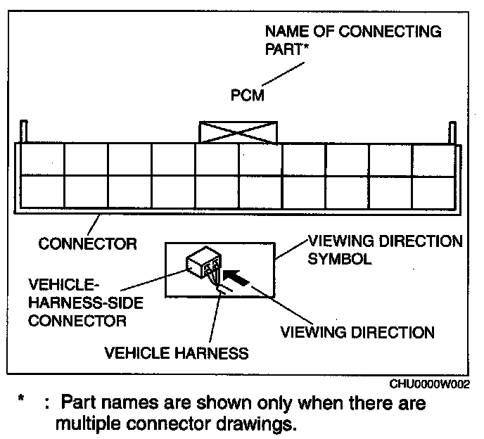 When it is necessary to show the terminal side of vehicle harness-side connectors, such as the following connectors, the viewing direction is from the terminal side.