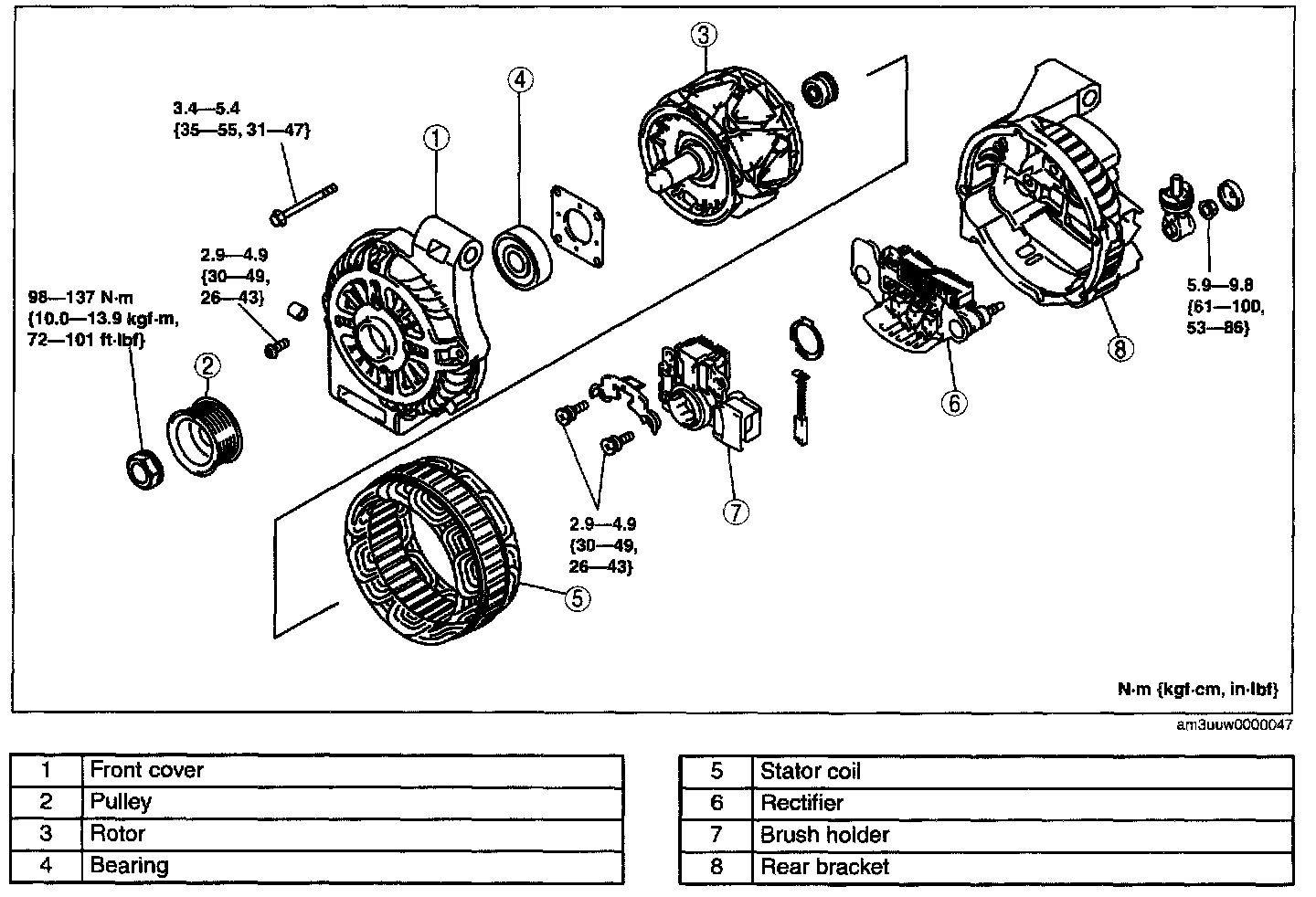 GENERATOR DISASSEMBLY/ASSEMBLY[LF, L3]CAUTION: Melt the solder quickly, otherwise the diodes (rectifier) and regulator will be damaged by excessive heat.