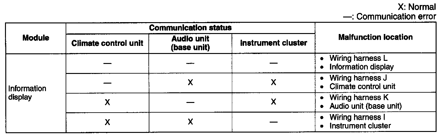 1. Inspect the display of DTC U0164, U0181 and/or U0184 using the input/output check mode. (See INFORMATION DISPLAY INPUT/OUTPUT CHECK MODE.) Component Tests and General Diagnostics