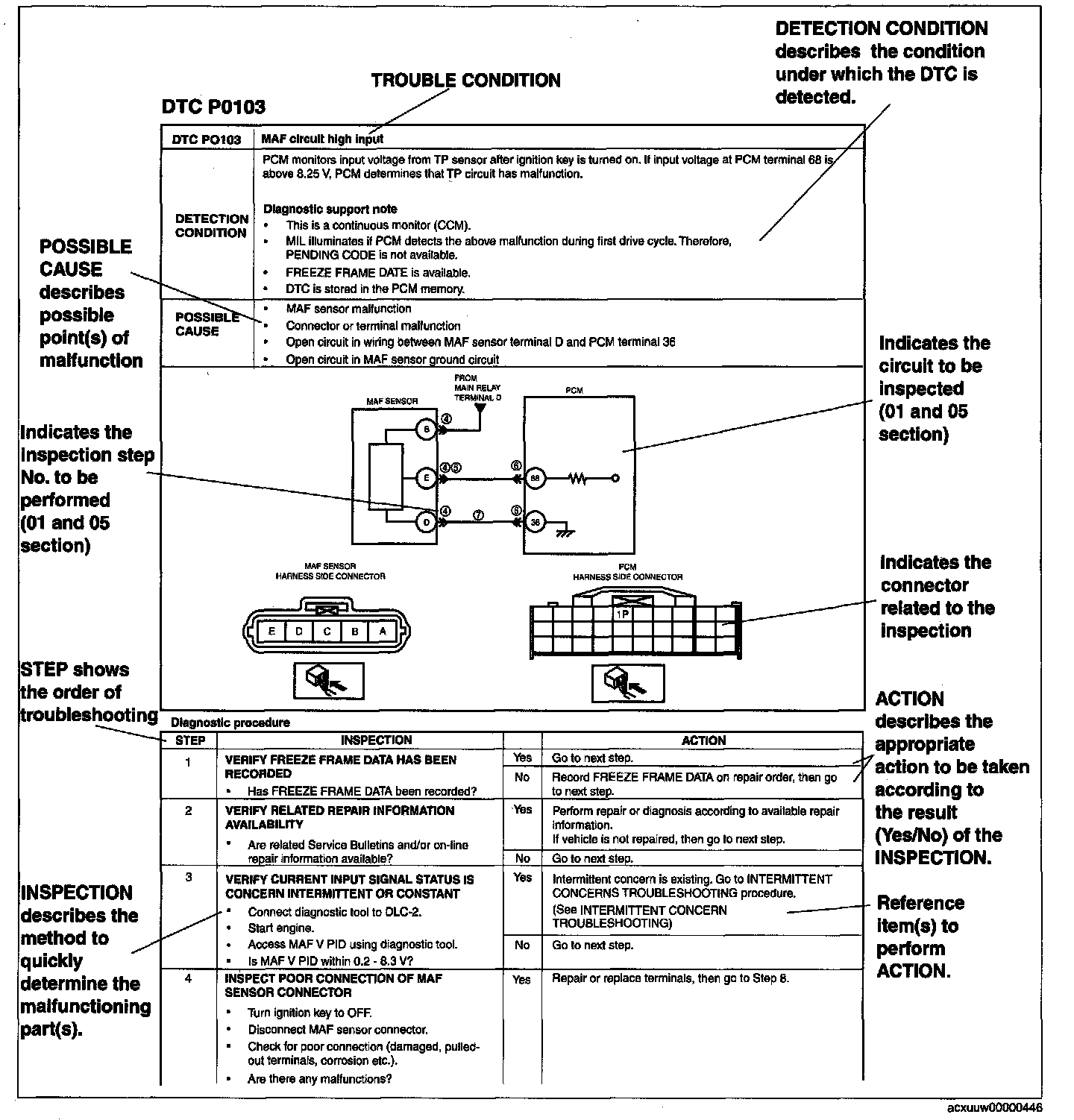 - DTC troubleshooting flow shows diagnostic procedures, inspection methods, and proper action to take for each DTC.