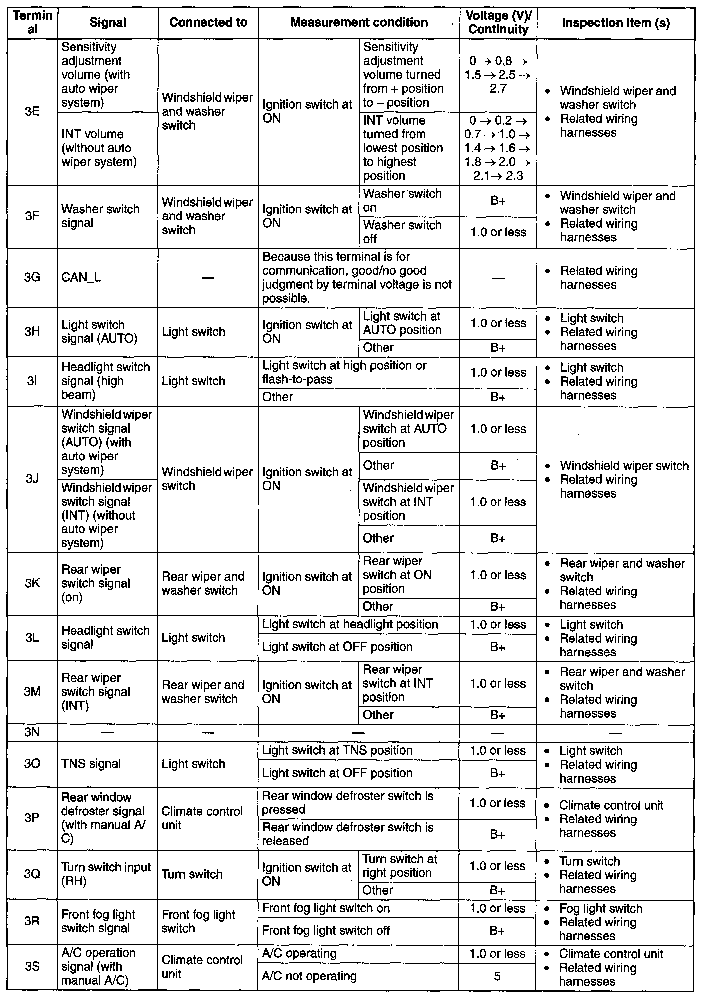- If the voltage or continuity is not as specified in the Terminal Voltage Table (Reference), inspect the parts under "Inspection item (s)".