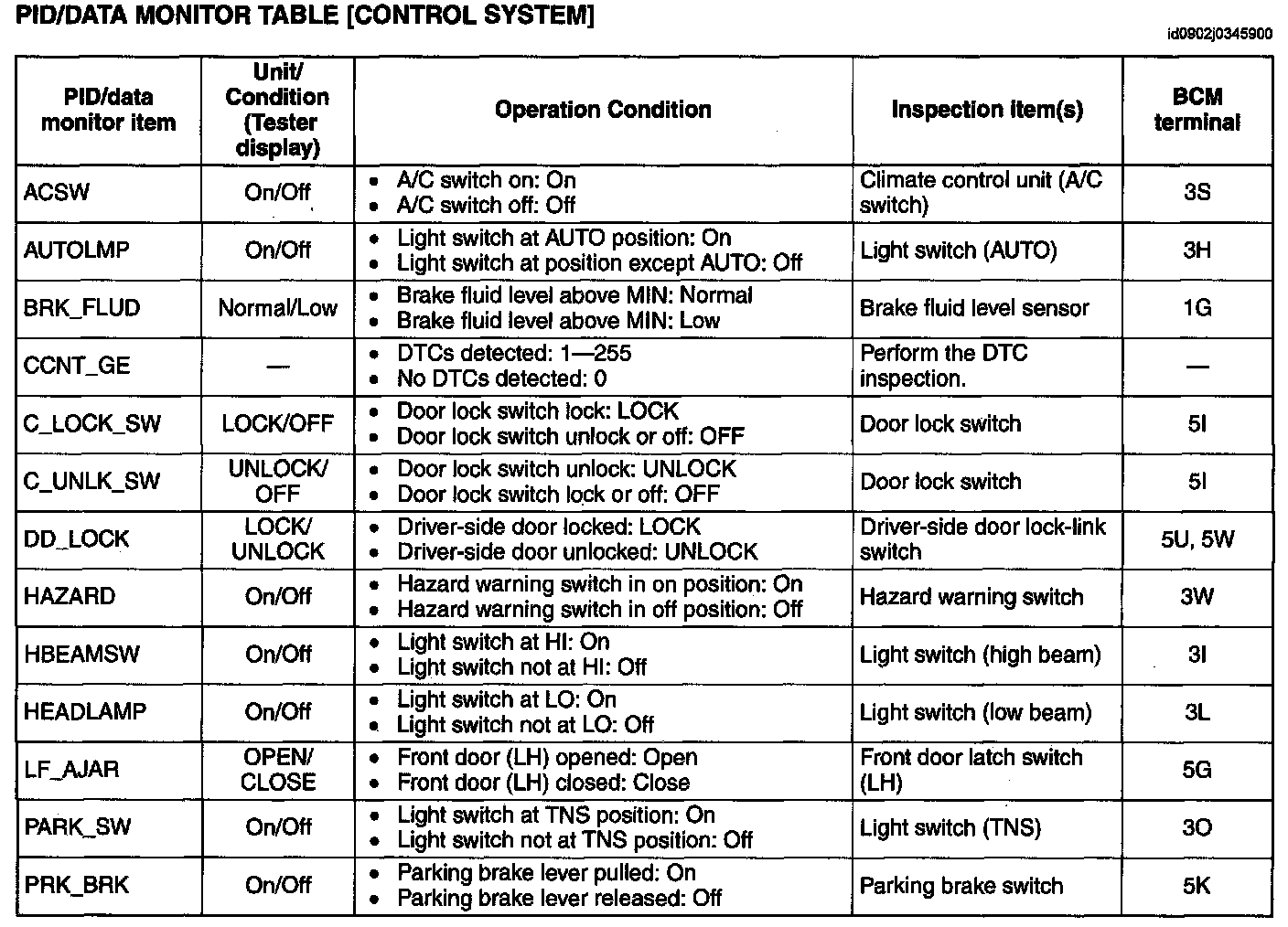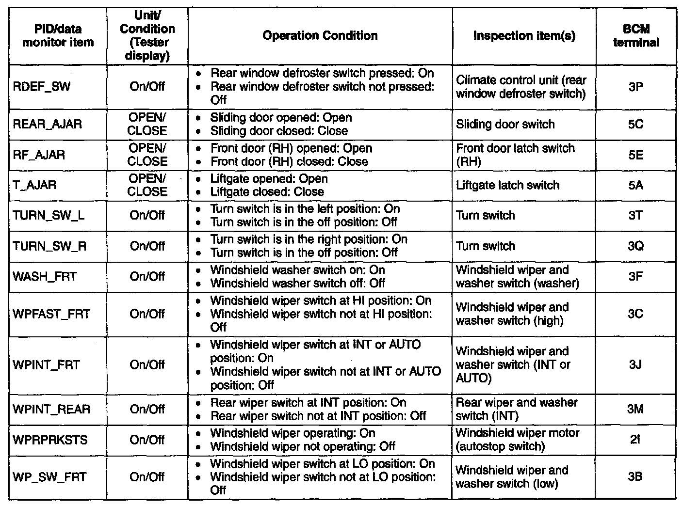 Home >> Mazda >> 2008 >> 5 L4-2.3L >> Repair and Diagnosis >> Powertrain Management >> Computers and Control Systems >> Body Control Module >> Testing and Inspection >> Pinout Values and Diagnostic Parameters >> PID/Data Monitor Inspection [Control System]