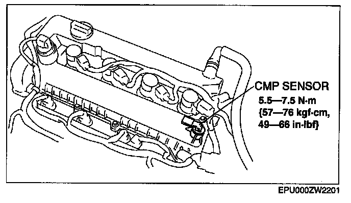 CAUTION: When replacing the CMP sensor, make sure there is no foreign material on it such as metal shavings. If it is installed with foreign material, the sensor output signal will malfunction resulting from fluctuation in magnetic flux and cause a deterioration in engine control.