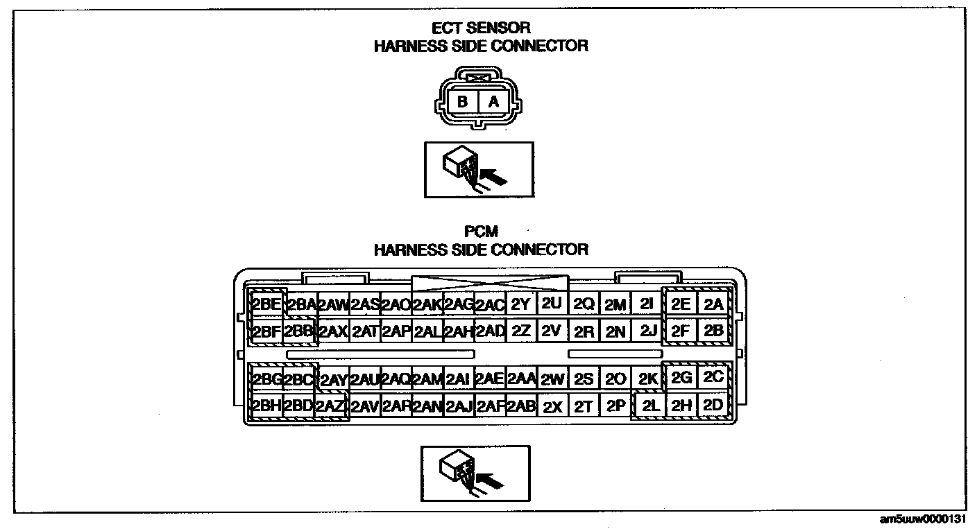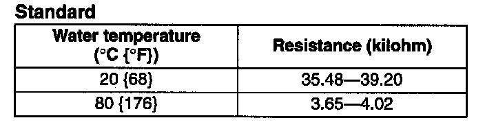 3. Place the ECT sensor in the water and while increasing the water temperature, measure the resistance between ECT sensor terminals A and B.