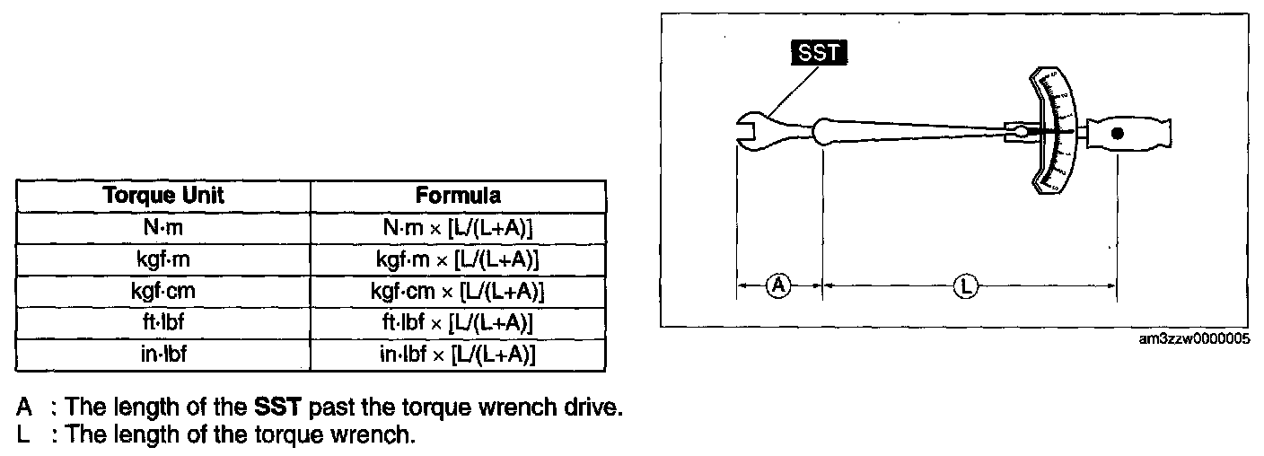 - When using a torque wrench-SST or equivalent combination, the specified torque must be recalculated due to the extra length that the SST or equivalent adds to the torque wrench. Recalculate the torque by using the following formulas. Choose the formula that applies to you.
