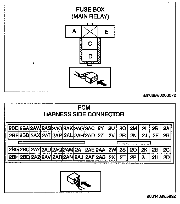 - Front HO2S terminal 2B and main relay terminal C