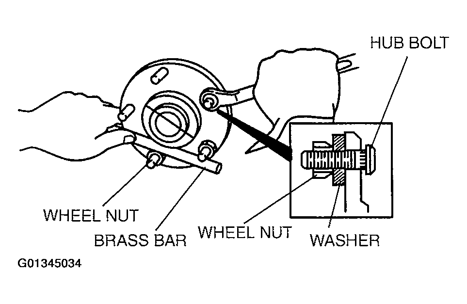 - Install the wheel hub bolt by placing a proper sized washer on the hub, and tightening the nut as shown. See Fig 2 .