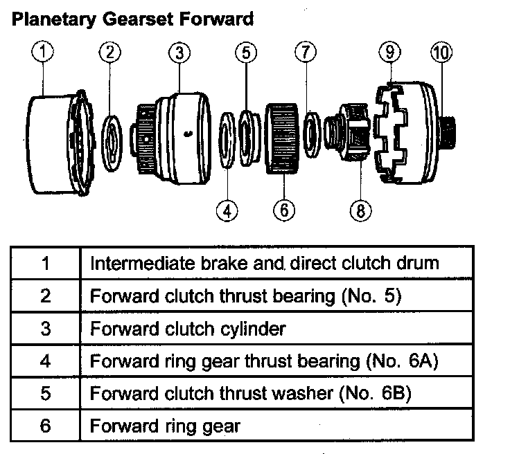 ^ The front planetary gearset carrier drives the center shaft via the overdrive one-way clutch in 1st, 2nd, and 3rd and 4th gears.