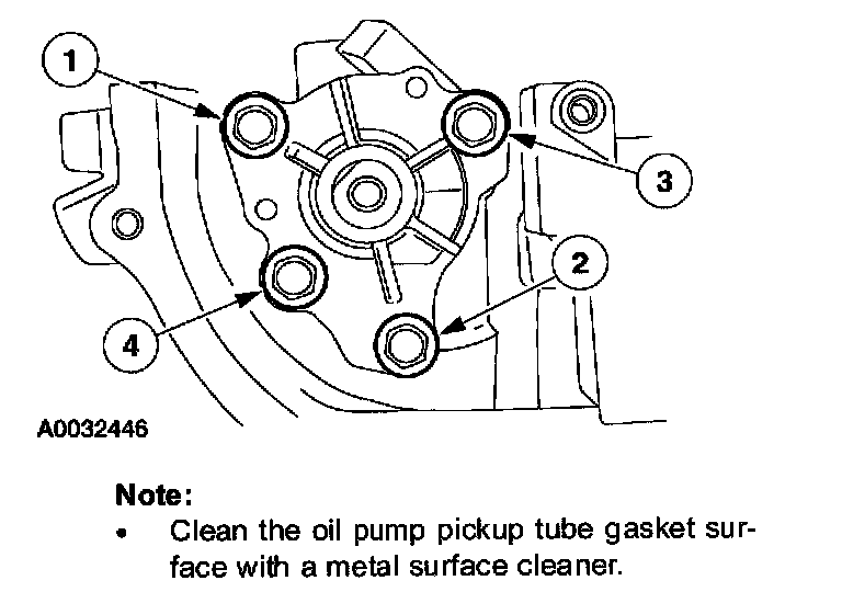Install a new gasket and the oil pump assembly. Tighten the bolts in the sequence shown in two stages.