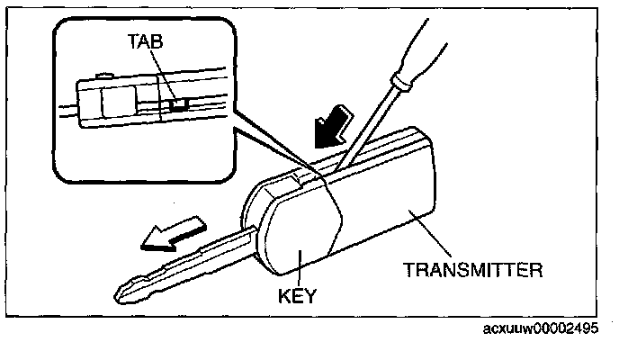 TRANSMITTER BATTERY REPLACEMENT [KEYLESS ENTRY SYSTEM]1. Insert a small flathead screwdriver into the transmitter notch and remove the key from the transmitter by pressing the tab.