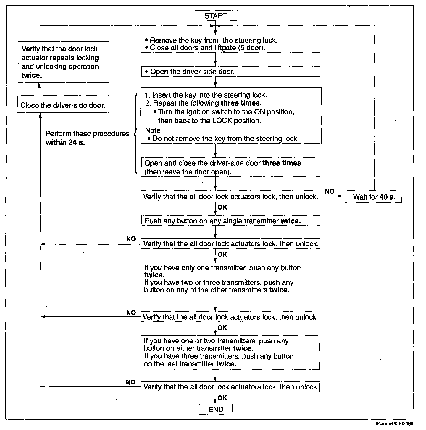 - After ID code registering, remove the key from the steering lock and verify that all doors lock/unlock normally using the transmitter.