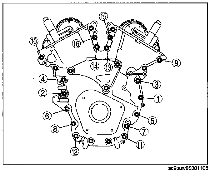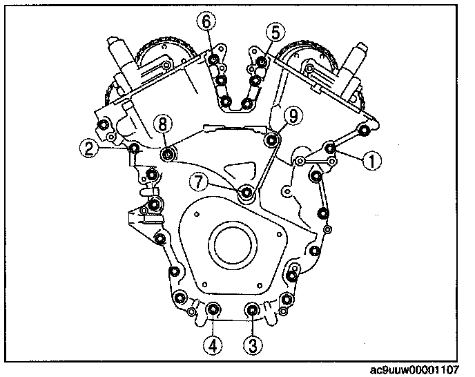 2) Tighten the engine front cover installation bolts in the order in 2 steps in the order shown in the figure.