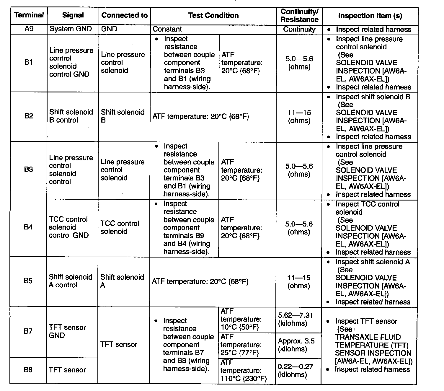 ^ Use the ground of terminal A9 of the TCM connector (wiring harness-side) when measuring terminal voltage, as an error may occur when connecting the negative circuit tester to ground.