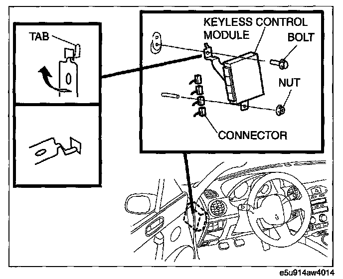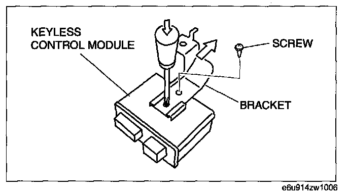 NOTE: The screw which fixes the keyless control module and bracket is for a body ground connection. Be sure to secure the screw when installing.