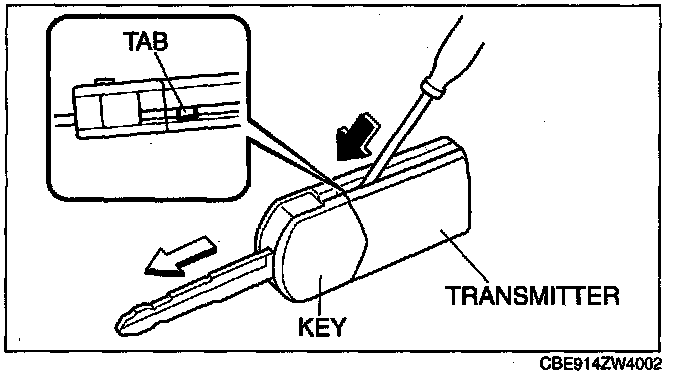 1. Insert a small screwdriver into the slot and push the tab to remove the key from the transmitter.