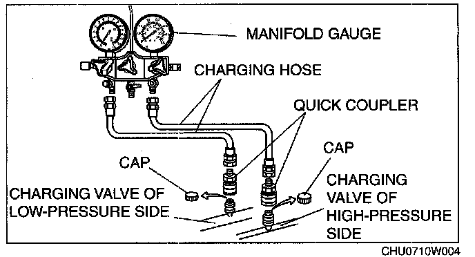 2. Connect the charging hoses to the high/low pressure side joints of the manifold gauge.