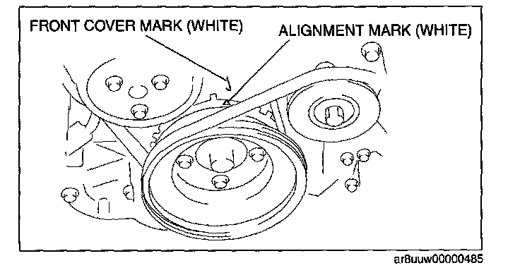 4. Verify that the eccentric shaft position plate alignment mark (white) and the front cover mark (white) is aligned.