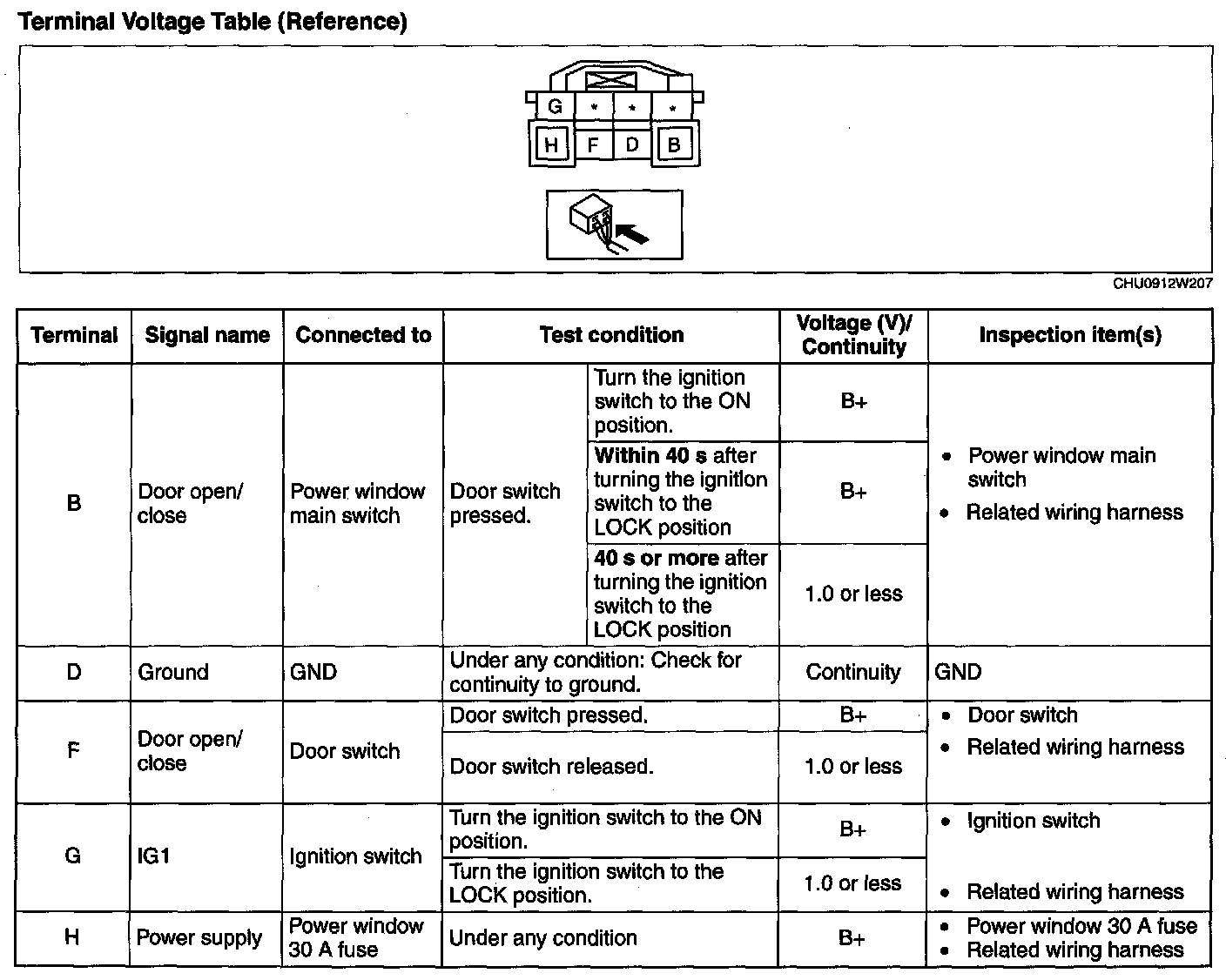 - If the voltage is not as specified in the Terminal Voltage Table (Reference), inspect the parts under "Inspection item(s)".