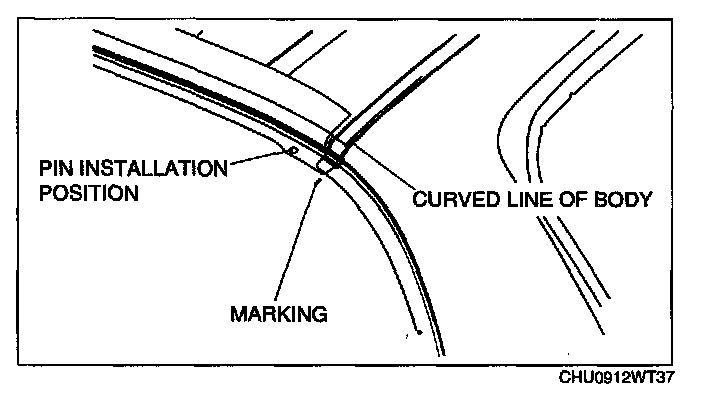 8. Position the marking on the rear window glass and the curved line of the body (roof molding) left and right so that they are aligned.