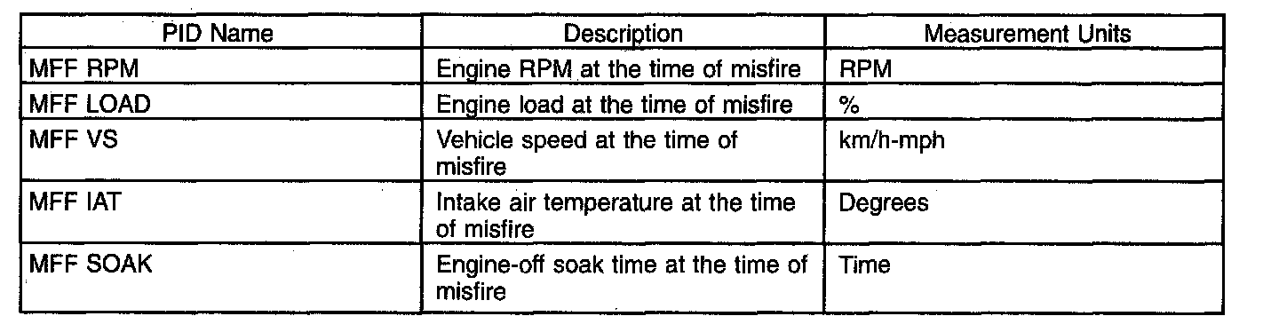 Some unique PIDs are stored in the Keep Alive Memory of the (KAM) of the PCM to help in diagnosing the root cause of misfires. These PIDs are collectively called misfire freeze4rame (MFF) data. These parameters are separate from the generic freeze-frame data that is stored for every MIL code. They are used for misfire diagnosis only. The MFF data could be more useful for misfire diagnosis than the generic freeze frame data. It is captured at the time of the highest misfire rate, and not when the DTC is stored at the end of a 1,000 or 200 revolution block. (Generic freeze-frame data for misfire can be stored minutes after the misfire actually occurred).