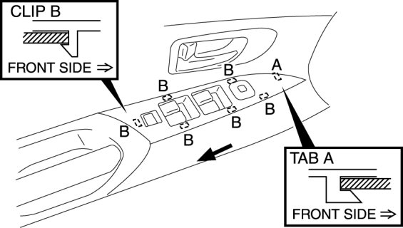 3. Remove the switch panel from the front door trim while sliding it in the direction of the arrow as shown in the figure.