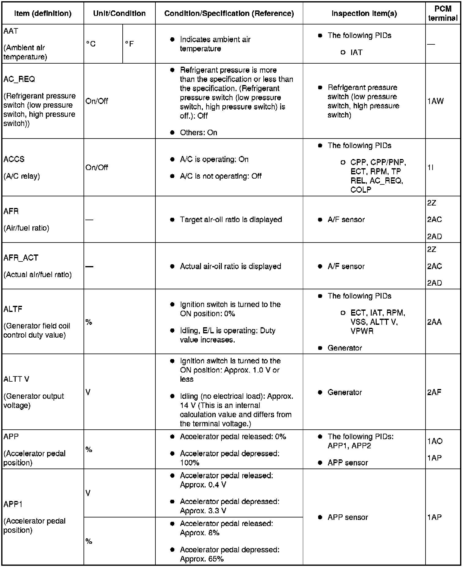 - The PCM terminal voltage can vary with the conditions when measuring and changes due to aged deterioration on the vehicle, causing false diagnosis. Therefore determine comprehensively where the malfunction occurs among the input systems, output systems, and the PCM.