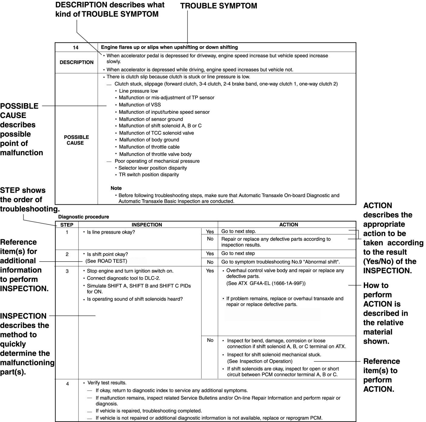 - Symptom troubleshooting shows diagnostic procedures, inspection methods, and proper action to be taken for each trouble symptom.