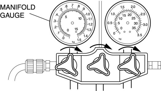 4. When the high-pressure side reading increases to 0.098 MPa {1.0 kgf/cm2, 14 psi}, close the low-pressure side valve of the manifold gauge.
